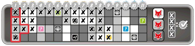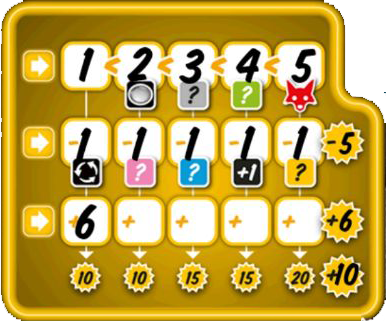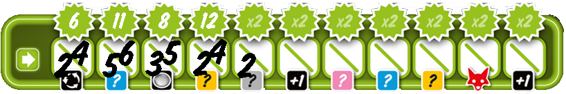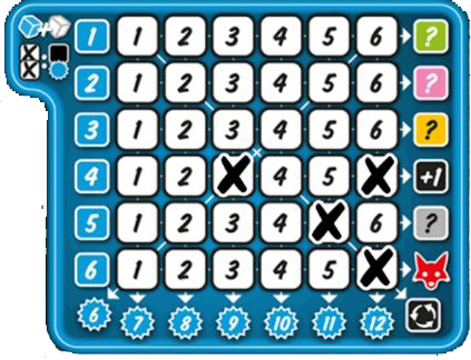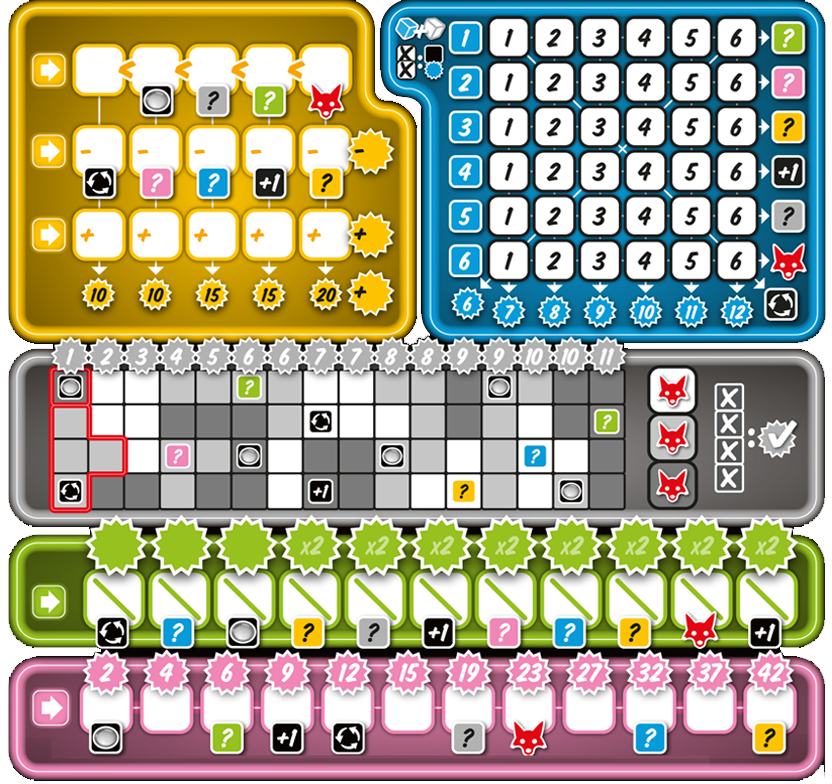 Some fields (or rows and columns) have a bonus. You get this when you mark the field (or when all fields in a row/column are marked). You also receive a bonus if you have collected all 6 of the 3 different actions (additional dice, number joker and additional dice actions). The bonus allows an entry in the corresponding color, or it grants a "post-roll, number joker or additional die action". The color bonuses must always be used immediately. If you get a fox, it brings additional points in the final score.