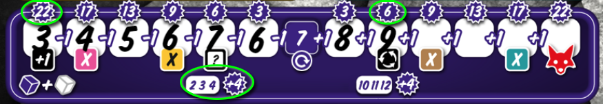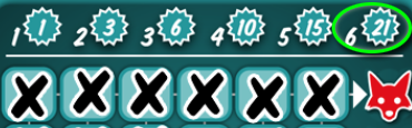 Some fields (or rows and columns) have a bonus. This is obtained when marking the field (or when all fields of a row/column are marked). In addition, you will receive a bonus if you have collected all 6 of the 3 different promotions (research, number-joker and additional cubes). The bonus allows an entry in the corresponding color, or it grants a "dropper, number joker or additional cube action". The colour bonuses must always be used immediately. If one obtains a fox, it brings additional points in the final settlement.