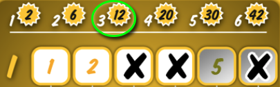 In yellow, one counts how many fields are crossed in each of the 3 lines of this range. Each line brings as many points as indicated in the table in the yellow range.