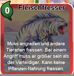 A carnivore can put other animals out of force by using the intelligence properties. For this purpose, it selects a hand card, activates the inelligenz and finally clicks on the desired property. This is now deactivated in ALL animal species until the attack has taken place. Of course, this applies only to this meat eater, which is therefore marked green.
