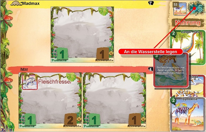 Players choose a handcard at the same time and place it hidden on the water hole. These food cards determine how much herbal food is available in this round. However, they are only exposed to freseses at the beginning of the phase. Until then, only the remaining food from the preliminary round is displayed.